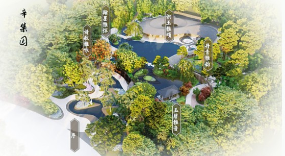 辛集園 ——玉文化園林 古韻味雅集 辛集園借《西園雅集圖》中文人雅士的5幕游園場(chǎng)景,提煉園林語(yǔ)言,以現(xiàn)代手法打造“詠、聽(tīng)、畫(huà)、題、辯”五大玉文化園林空間,展現(xiàn)人文內(nèi)涵深厚的雅集新貌。 “詩(shī)歌雅詠”場(chǎng)景,取雅集中觀書(shū)之意境,選取詠玉詩(shī)篇于云墻之上:青瓦化山,云墻為卷,石臺(tái)為案,詩(shī)情處處融畫(huà)意;“玉磬雅音”場(chǎng)景,取雅集中聽(tīng)琴之意境,林蔭華蓋轉(zhuǎn)譯為鄰水雅軒,軒內(nèi)懸掛最具代表的玉石樂(lè)器——玉磬復(fù)制品,聽(tīng)著源自上古的玉磬之聲,臨水坐看對(duì)岸林泉山澗,頓入空谷幽蘭之境。